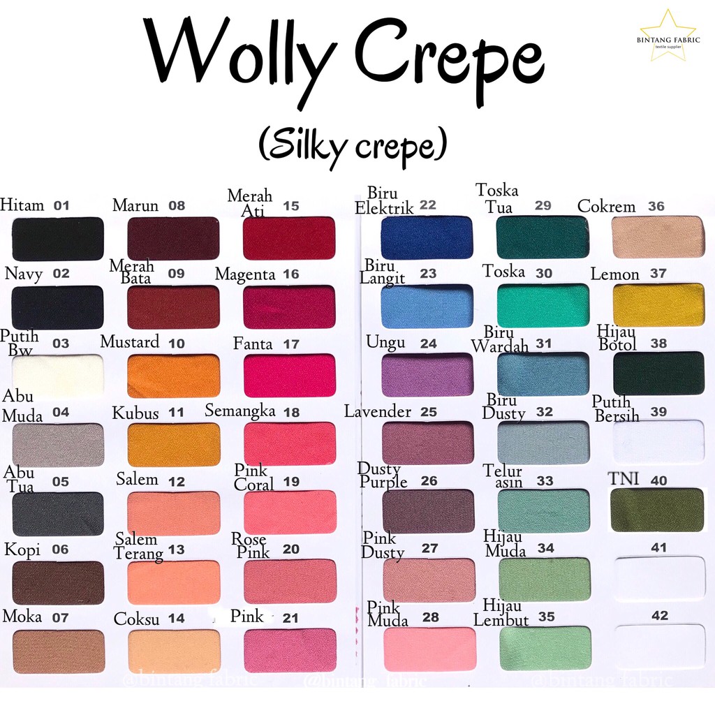 Informasi mengenai bahan kain wollycrepe. Kain wollycrepe adalah salah satu jenis kain yang banyak digunakan untuk pembuatan pakaian. Beberapa jenis bahan wollycrepe yang cukup populer di indonesia di antaranya ialah bubble crepe, arabian crepe, crezia crepe, dan diamond . Bahan kain wollycrepe gamis syari dress jilbab kerudung cadar. Beli produk kain wollycrepe berkualitas dengan harga murah dari berbagai pelapak di.